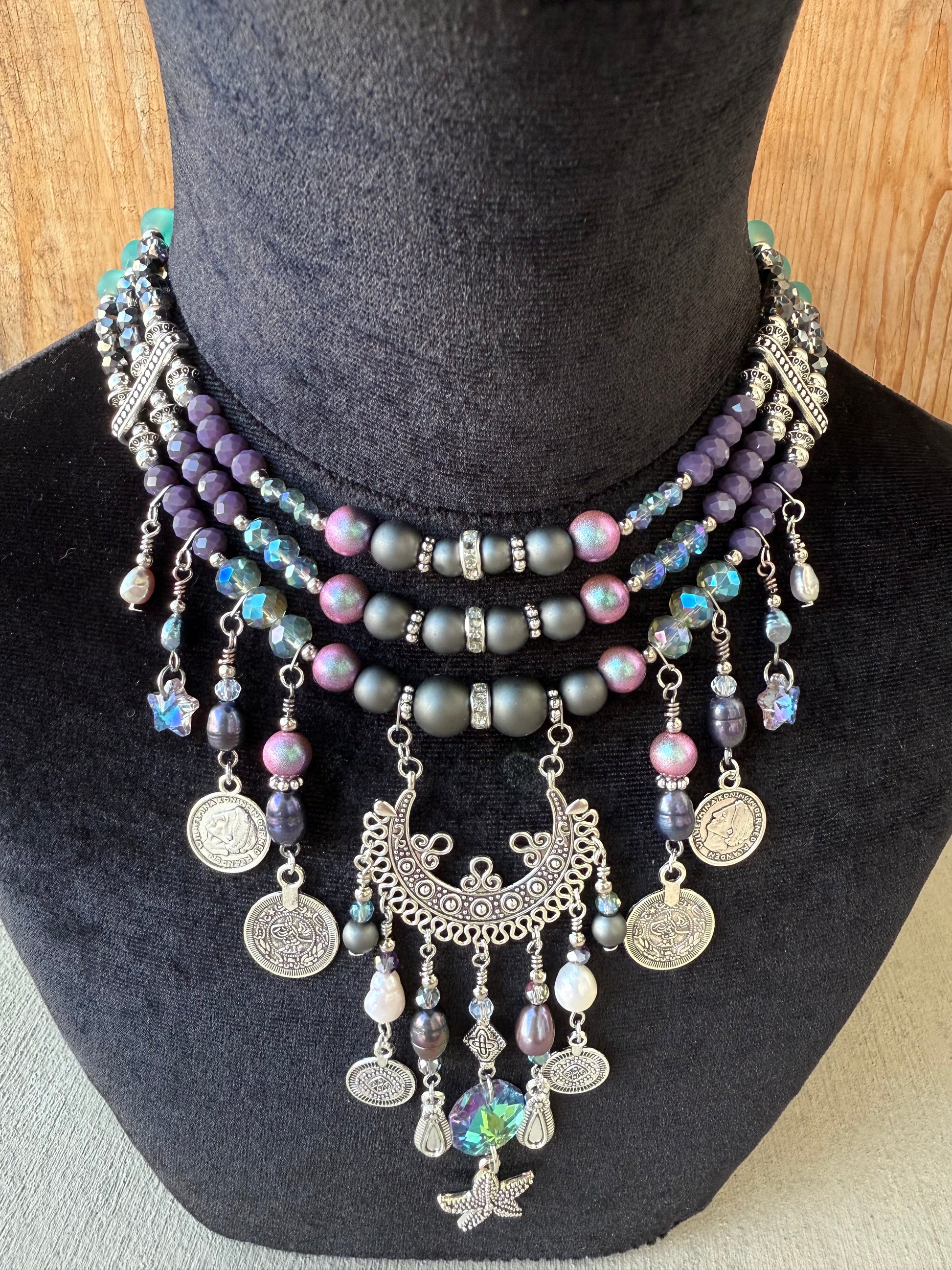 This hand crafted headpiece features a large resin center with beautiful super-shift shells