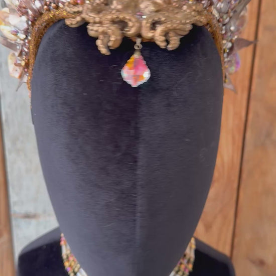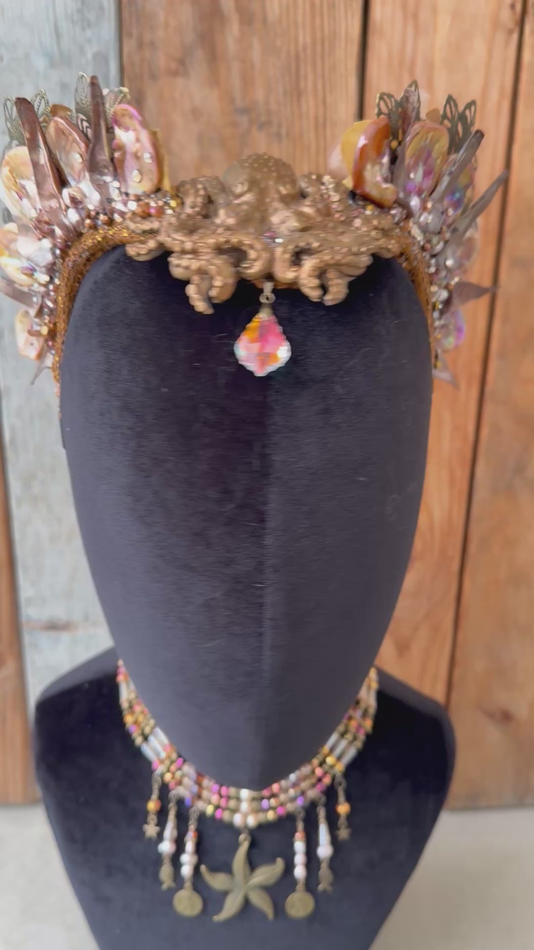 This hand crafted headpiece features a large resin octopus center with beautiful mother of pearl