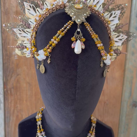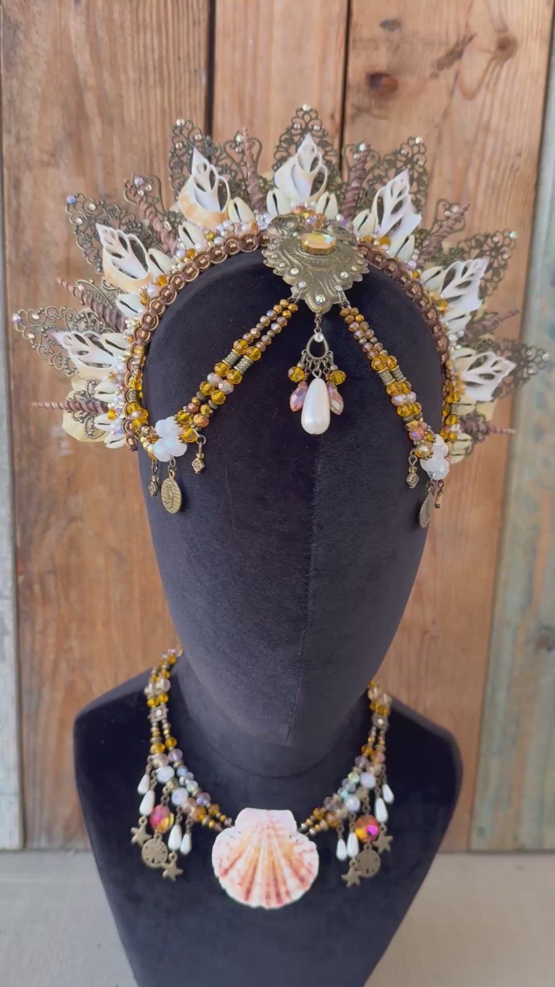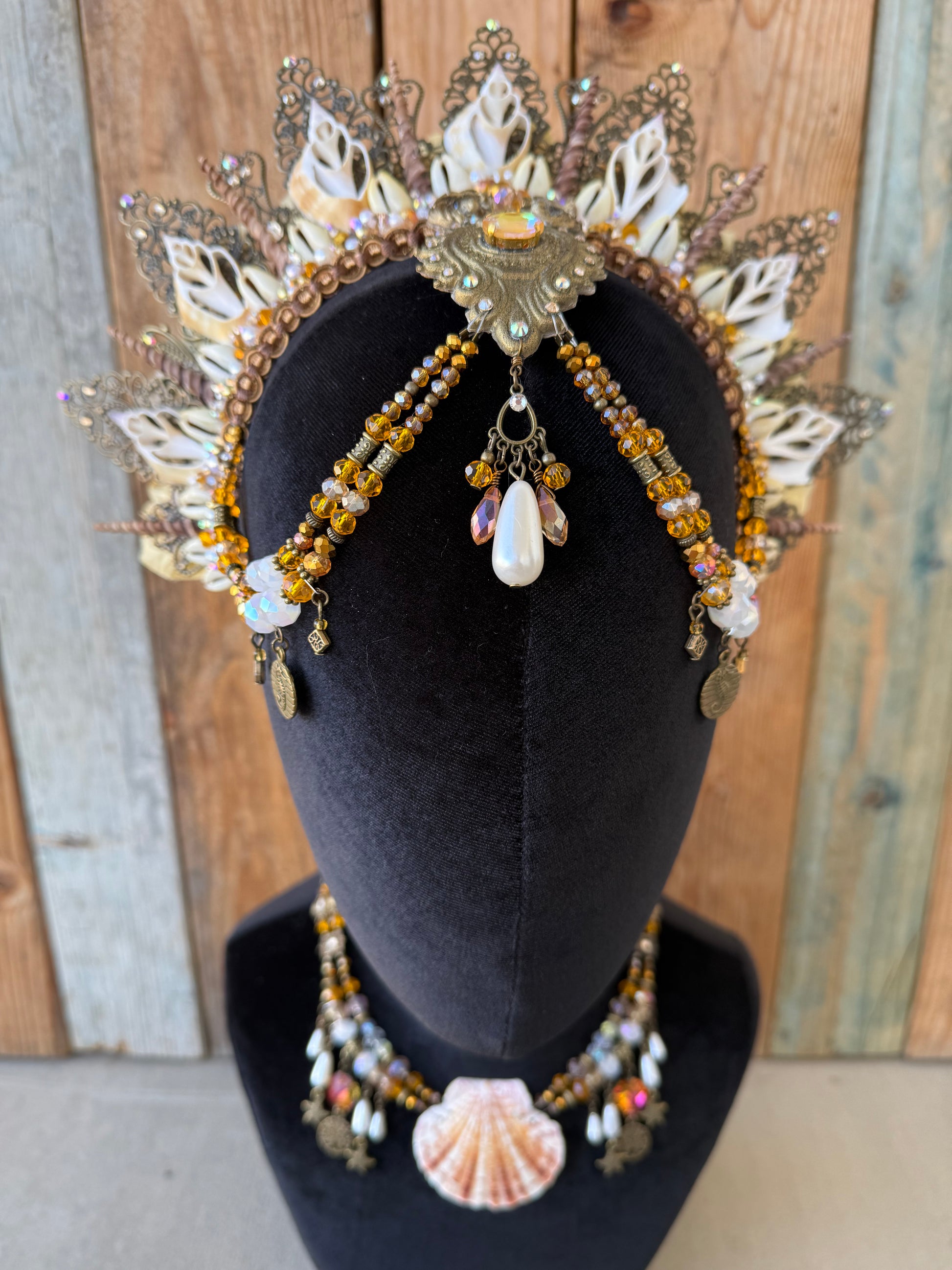 This hand crafted headpiece features a large resin center with beautiful shell necklace.
