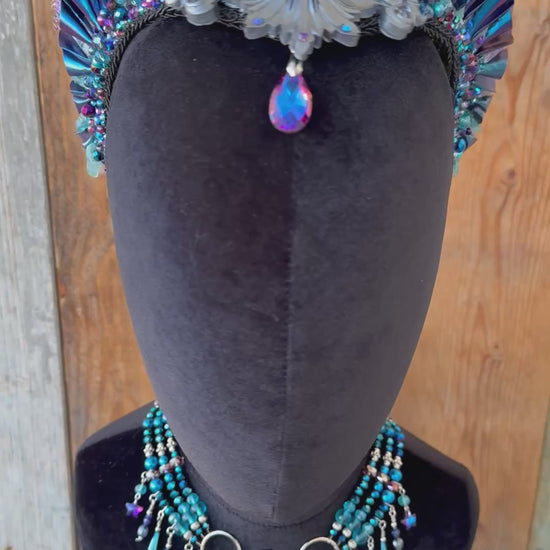This hand crafted headpiece features a large resin center with beautiful super-shift shells