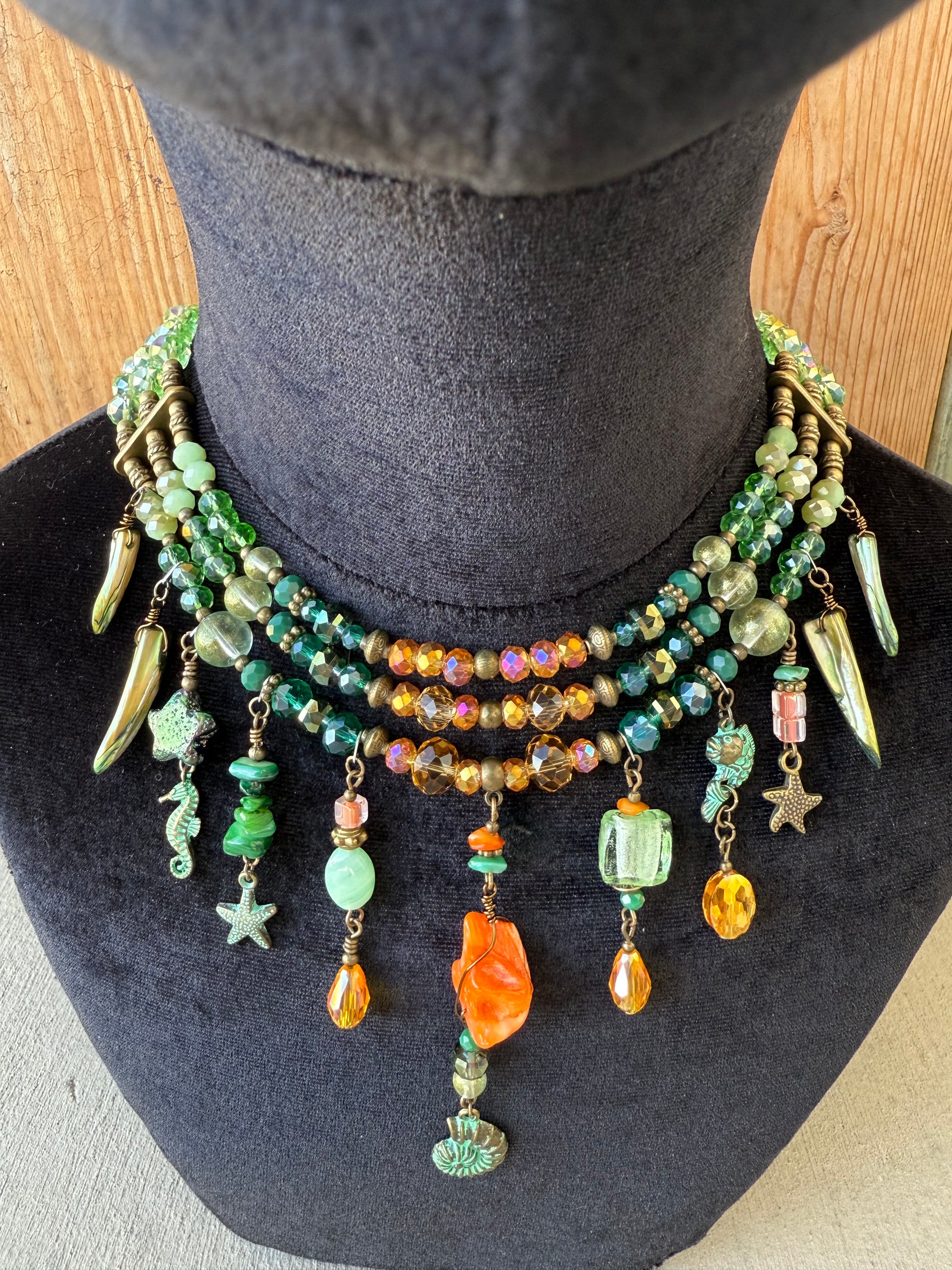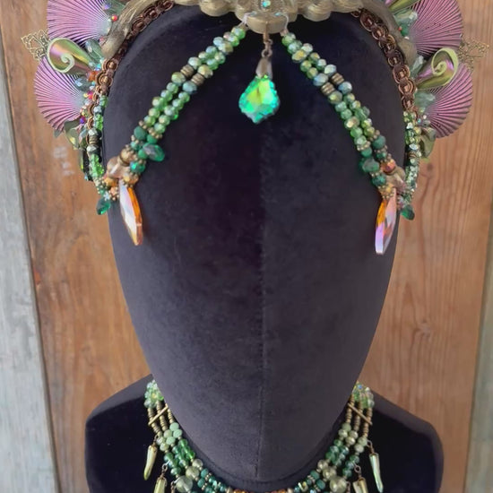 This hand crafted headpiece features a large resin center with beautiful super-shift shells