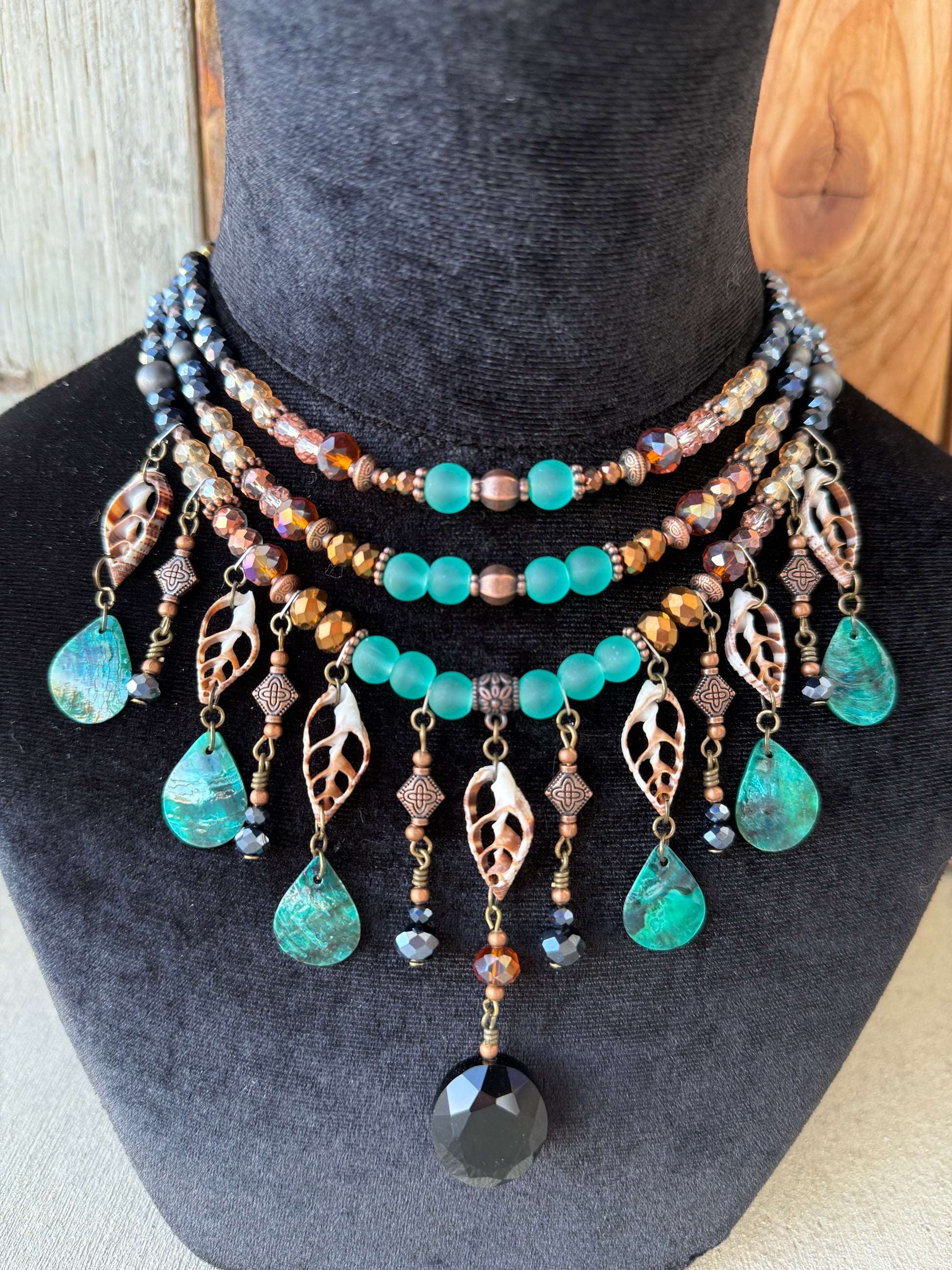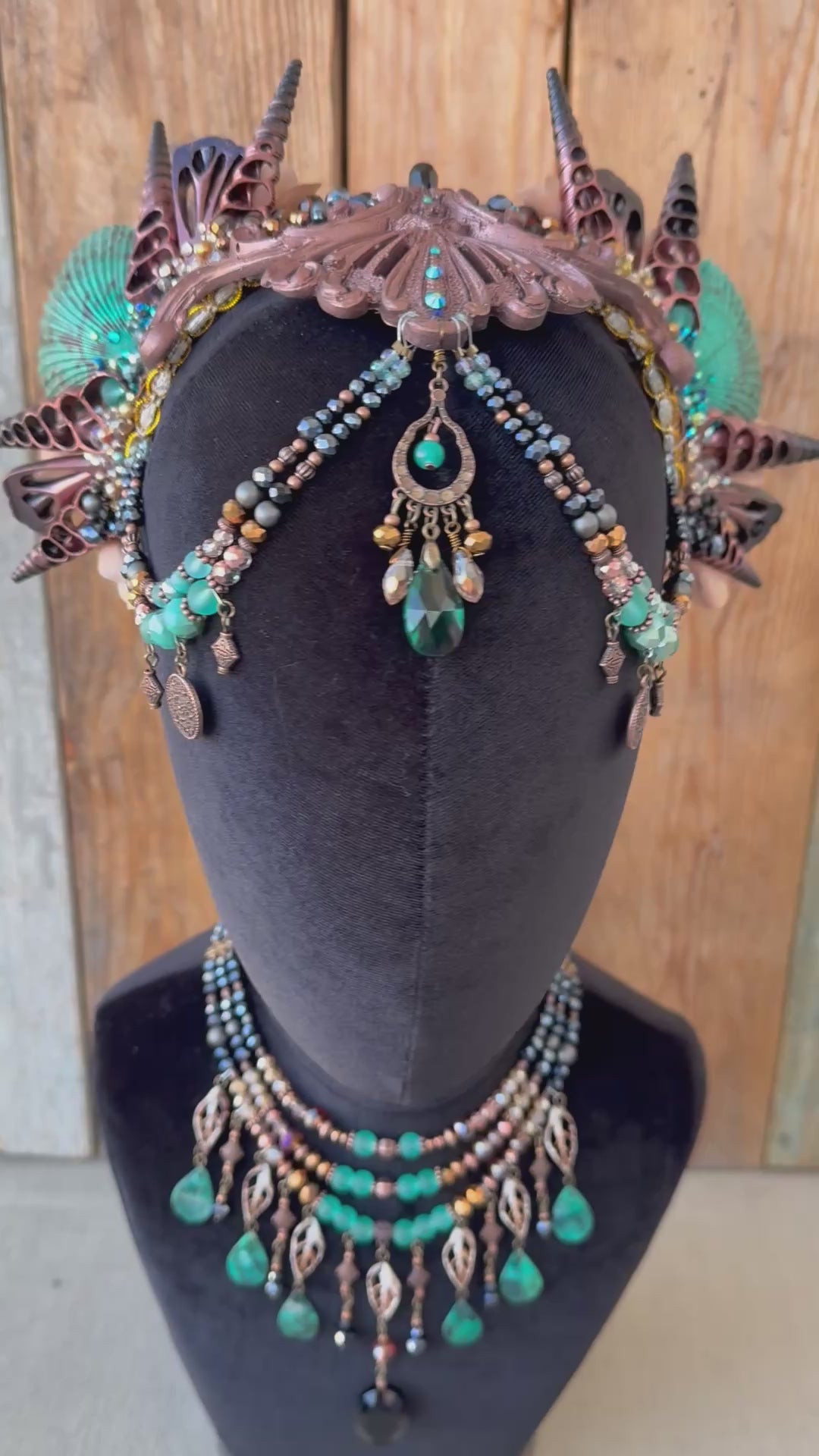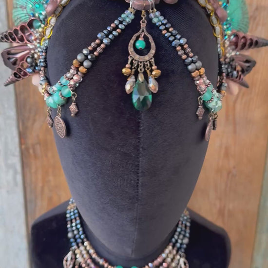 This hand crafted headpiece features a large resin center with beautiful spiked shells.